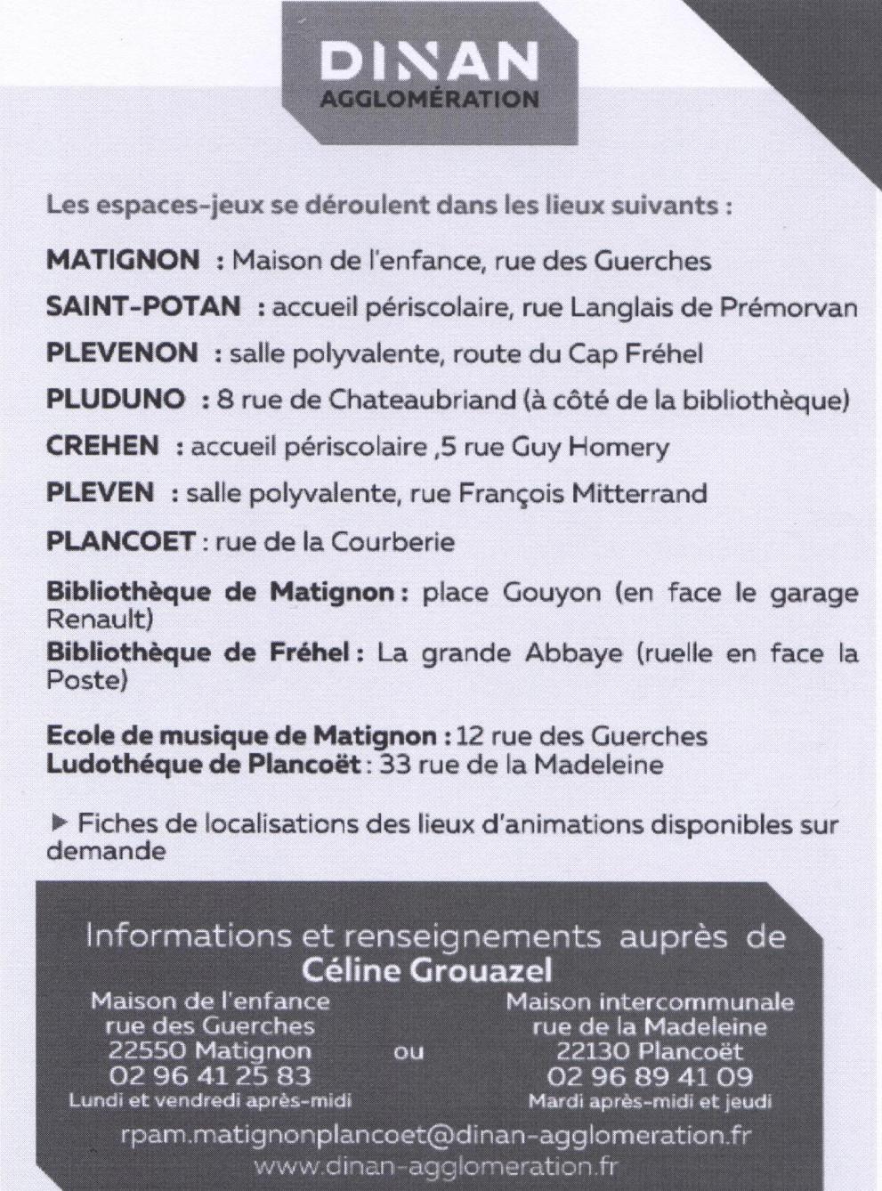 Pour visualiser le programme des espaces-jeux, visitez le site internet de Dinan Agglomération, rubrique "petite enfance", et vous aurez toutes les informations.