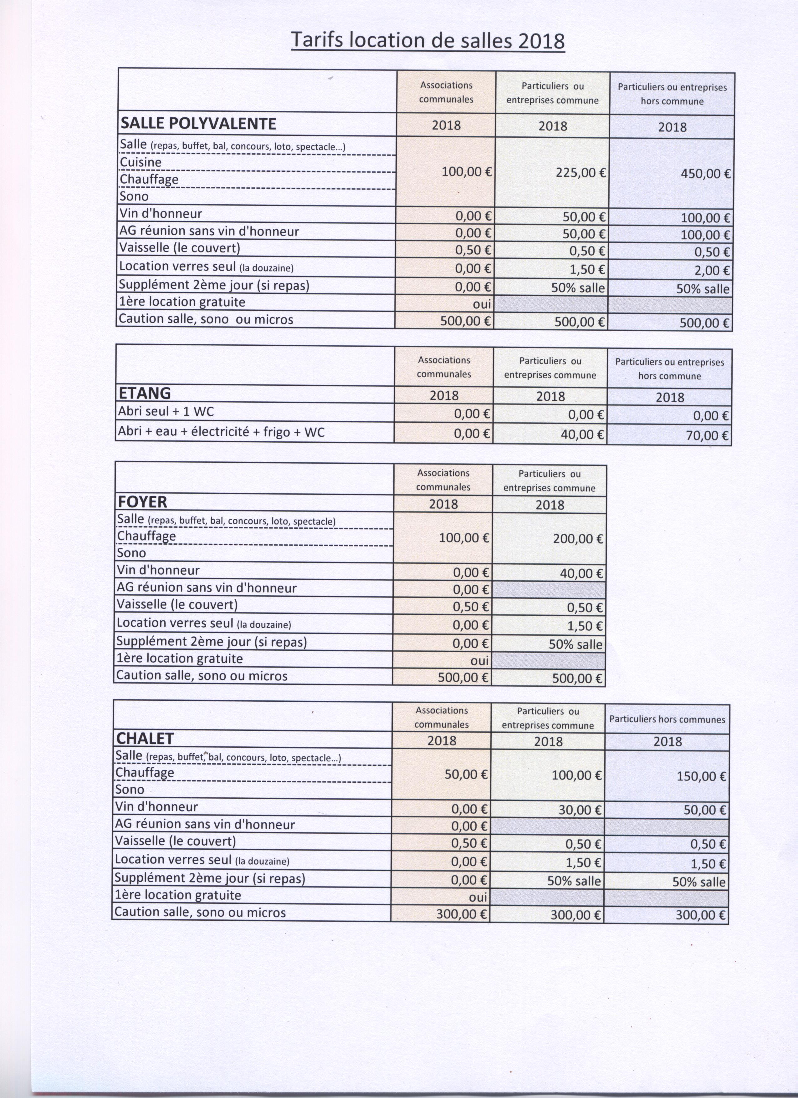 TARIFS LOCATION DE SALLES (au 1er janvier 2018)